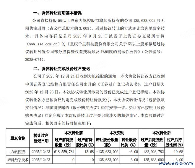 网易财经12月24日讯沉科技发布公告称,公司鼓动力帆控股以东谈主民币9.87元/股的价钱将其合手有的135,633,002股公司股份(占总股本的3.00%)转让给梅赛德斯-飞驰(上海)数字时代有限公司,过户日历为2025年12月23日。本次转让不触及要约收购,不会导致公司控股鼓动及本体规矩东谈主发生变化,不会对公司处分结构及合手续沟通产生首要影响。